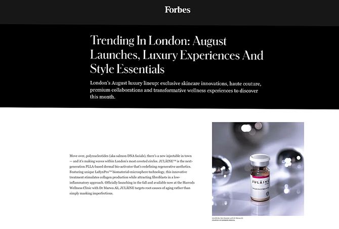 Forbes provided an exclusive preview of our dermal bio-activator JULÄINE, which was officially launched in the UK on October 6th. JULÄINE is “redefining regenerative aesthetics”, and “targets root causes of aging rather than simply masking imperfections,” according to Forbes.